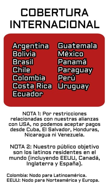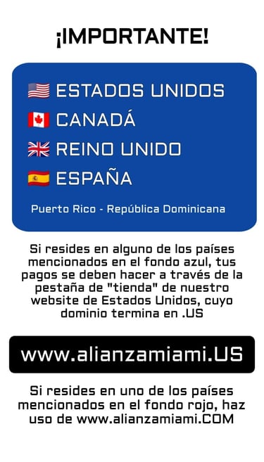 Para pagos desde uno de los países mencionados en el fondo rojo, puedes usar tarjetas débito o crédito, transferencias bancarias, PSE, o pagar en efectivo en puntos físicos como (por ejemplo, en Colombia) Efecty, corresponsales de Bancolombia, Punto Red, Apostar, Gana, Megared, Susuerte, Sured... Para ello usa la opción de pago llamada "DLocal" cuando el sistema te ofrezca las alternativas. Adicionalmente, a través de la opción "PayPal", podrás pagar con cualquier tarjeta débito o crédito desde cualquier país del mundo. De acuerdo con el país, nuestros principales intermediarios de pago online aparecerán como Americana de Idiomas, José Rodríguez, JR Consultores Empresariales, Jason David, Alianza Miami, Joseph Rogers o Alianza Americana.